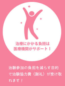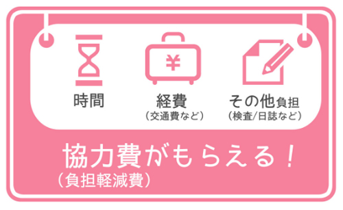 新薬を待っている患者さんの役に立てるという大きな社会貢献ができる一方で、参加者の時間的拘束や労力に対して、負担軽減費(協力費)が支払われます。